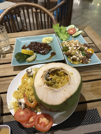 So the fried rice was good. However, everything else was overprice and not good. We didn't try the sea food so potentially that was a mistake but just by seeing the number of food options I had a bad feeling (you can't have that many options and have all of them fresh). The watermelon was cooked (why??), presentation was awful. Beef was overcook (they didn't ask us what we wanted). The best was the dessert: we were surprised by the interesting price of the pastries and ordered two. They were cheap because they were 1/4 of the normal size^^ and worse was, they were completely disgusting. We couldn't even finish it.... Sorry I forgot, the coconut water was...