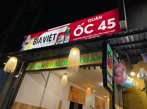 Quán ốc 45 nằm trên đường Nguyễn Đình Chiểu, Mũi Né, Phan Thiết, là một điểm đến lý tưởng cho những ai đam mê hải sản. Đồ ăn ở đây hợp khẩu vị, với các món hải sản tươi ngon, được chế biến tinh tế và hấp dẫn. Một điểm cộng lớn là hải sản luôn đảm bảo tươi sống, mang lại hương vị tuyệt vời cho từng món ăn. Thời gian ra món cũng rất nhanh, giúp thực khách không phải chờ đợi lâu để thưởng thức.