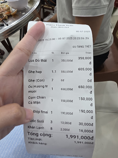Read moreUp bill và hình ảnh để chứng tỏ mình có ăn. Mình là khách du lịch, lúc vào mình có đến quầy lựa hải sản, ốc hương ở quầy hải sản to chà bá, lúc mình hỏi thì báo giá 550k/kg. Lúc lên món thì con to con nhỏ mình và gia đình đã thắc mắc rồi. Chuyện sẽ không có gì nếu lúc tính tiền lại ra bill là 650k/kg. Mình thắc mắc mình hỏi thì ko một câu xin lỗi hay giải thích mà kêu "chị nghe nhầm thôi ạ". Mình kiểu ba chấm :))) chủ quán thì ngồi đó mà cũng lơ khách luôn. Út mình có thắc mắc hỏi sao nãy ra lựa thấy ốc cồ to to không mà thì chị nhân viên dẫy đành đạch lên kêu ốc cồ ko có giá đó đâu chị ơi :))). Đọc cách quán trả lời các khách hàng khác là hiểu rồi. Các khách hàng không muốn vừa tốn tiền vừa chuốc bực vô người thì cân nhắc khi đến quán nha. Không cải thiện thì có ngày cũng đóng cửa hoặc ngáp ruồi thôi ạ. Thời đại công nghệ khách hàng dễ dàng tìm kiếm thông tin tham khảo chứ không như hồi đó dễ bị thao túng đâu ạ. 1 lần và mãi mãi...