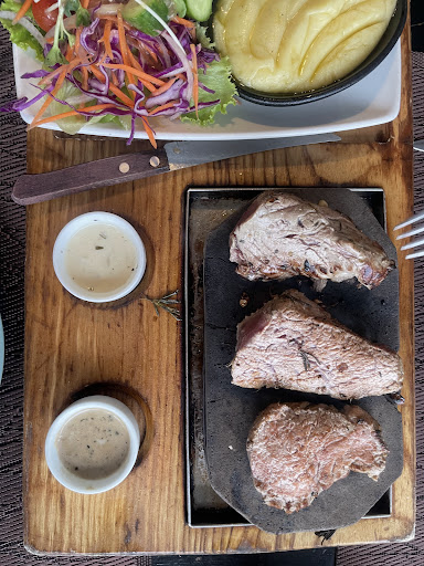 We ordered a hot stone steak, which I’d guess was around 250-300g, priced at 310K VND. It arrived sizzling on a black hot stone and immediately caught our attention. The steak was incredibly tender and delicious, especially when dipped in the mushroom and pepper sauce. It came with two small sides: a simple salad and mashed potatoes, both of which complemented the dish perfectly.