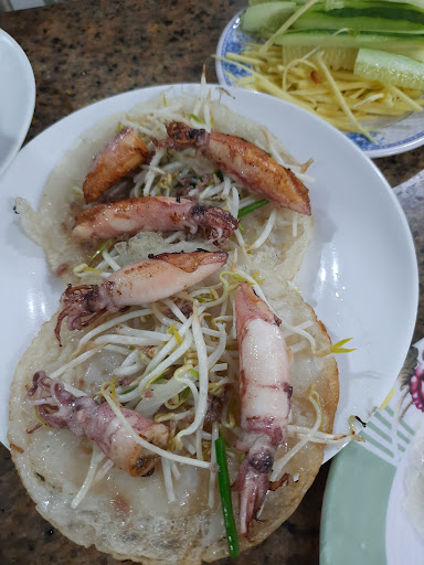 Cái 10 phút sau, chị đem lại 1 dĩa có 2 cái bánh xèo mực. Mình hỏi lại ủa kêu 1 cái mà sao có 2 bánh. Chị trả lời "Đúng rồi 1 dĩa là 2 cái bánh". Mình cũng hơi ngờ ngợ rồi haha, mà sợ mình ko hiểu từ "cái" ở Quy Nhơn có lẽ có nghĩa khác ko. Vì thật sự mình chỉ kêu 2 cái thôi. Nhưng vì ăn cũng khá, nên mình ăn luôn.