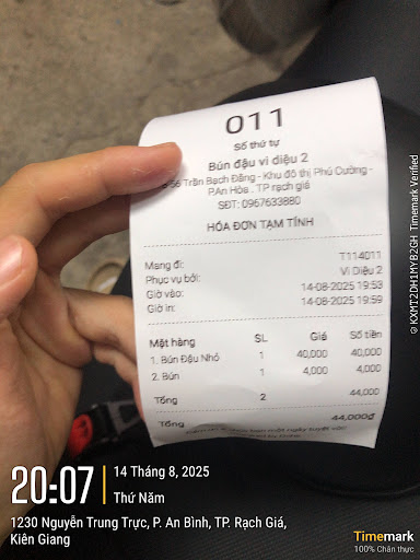 Read moreVào quán kêu 2 chai sâm , 1 phần bún đậu đặc biệt 2 người. Đem ra 2 chai sâm xong ngồi đợi gần 20p. Có 2 bàn vô sau oder sau. Mà ngta có đồ ăn trước. Mình gọi nhân viên quán 2 lần để hỏi. Cũng k bạn nào phản hồi lại. Bước lại quầy thanh toán 2 chai sâm nói với bạn nhân viên. Cũng không nhận được phản hồi thông cảm...