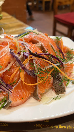 In details, we order a salmon hotpot which is served with slices of salmon, it feels hassle when eating because of the small salmon bones. The broth is quite sour, sweet and smooth, very suitable when eating in Sa Pa's weather. Salmon sashimi is also a good option to try there.