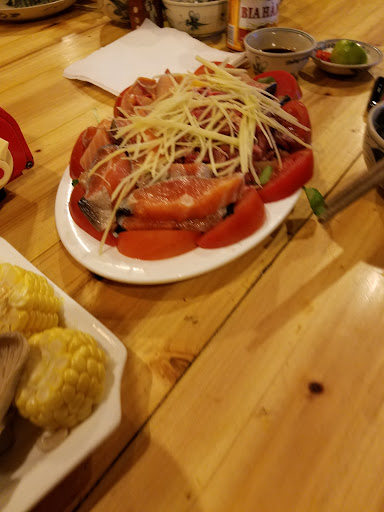 We had salmon and sturgeon hotpot and smoked pork accompanied by a bottle of apricot wine during our first visit. The salmon and sturgeon were very fresh, the broth was light a demure Tom yum, very comforting and delicious. Apricot wine pairs really well with the food.