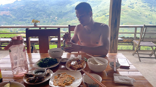 This place is definitely worth a walk through the bamboo or a drive up the hill. Owned by a lovely family and they serve the nicest coconut coffee I’ve ever had in my life. Their apple and cinnamon tea is also very special! Prices here are lower than anywhere else in the area, and the man went into his vegetable garden to get our veggies fresh to order. Everything we ate was delicious and their dipping sauce for spring rolls is unique and tasty! They have a vegetarian section on their menu also and everything is in English and Vietnamese!
