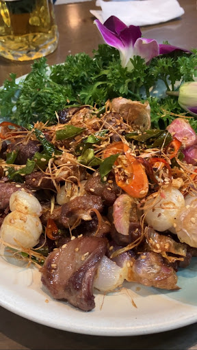 A big restaurant. It seemed popular with groups of middle aged men at lunch time. Always a good sign. The atmosphere was fun. We ordered a goat dish with lemongrass and the roasted duck. We were expecting it to be peking duck as it showed cucumber and wraps in the photo but it was just the duck on it's own. Both dishes were delicious. The duck had a thin green herb on it (possibly dill?) which gave a delicate zing to it. The goat meat was packed with flavour, cooked with lime leaf, garlic and lemongrass and served with extra lime leaf, perilla and other leaves for wrapping. Staff were helpful and communicated through Google translate, which made things easy. There was a whole goat on a spit at the back, probably to be...