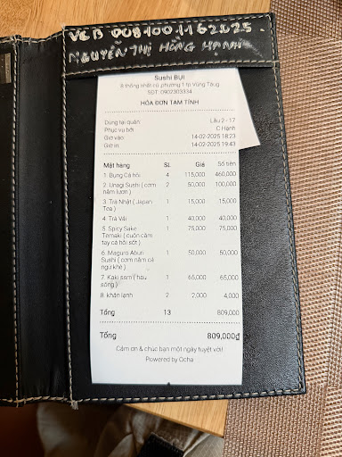 Read more11/07/2022 - Brought a colleague of mine to have sushi after few weeks offshore. Did not disappoint. Pricing was actually quite competitive and definitely lower than KL and surprise surprise, the quality of the cuts were actually not bad. Had Tuna Maguro and it was fresh and taste-wise puts a lot of the more established sushi restaurant in KL to shame. We thoroughly enjoyed our meal. Would recommend to return. We had 2 different Unagi maki, 2 other variety of rolls, and 1 hand roll, 1 salmon sashimi platter, 1 order of sea urchin, and mixed Tempuras. all for 998k VND which would easily be way more in KL. And servings and presentation was good. Definitely should be rated way higher than Hana Sushi that's located few streets away. Bui Sushi had pretty good ambience and had good japanese decor and air conditioned. Hana sushi was rated higher and no airconditioning? I can't understand that. and their sushi prep area was a cart in front of the store by the roadside? eww.. hygiene issues no? Was at the front of Hana Sushi and immediately we walked away. Headed to the next closest place for sushi and it was Bui Sushi. Lucked out...