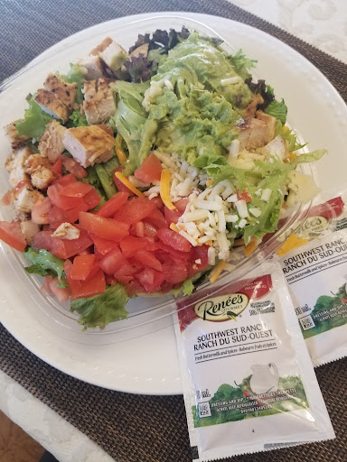 Today I had the southwest chicken salad. It was pretty good. Here is how they describe it: Herb-marinated, grilled 100% Canadian chicken breast hot off the grill, pepper jack cheese, diced tomatoes, cool, creamy avocado, topped with Applewood smoked bacon and Renée’s Gourmet® Southwest Ranch Dressing, all on a bed of Wendy's signature lettuce blend. It's zesty and Southwesty! The chicken was delicious, and the cheese and avocado were plentiful. The salad dressing was perfect for this type of salad. The only thing that was missing was that they forgot to put the bacon on it! It was probably even more delicious if it came with bacon. That's why I only gave it four stars. Because somebody screwed up. If they ran out of bacon they should have told us. We went through the drive-thru and the customer service was very nice.