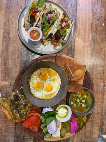 We ordered the Lebanese Breakfast (which comes with the bread in the second photo), the Shawarma tacos and Awarma and egg pizza. Had wanted to try the cheese spring rolls but they had sold out. All the plates we ordered were flavoursome and very well presented. Coffee was great. (Order coffees separately from the Barista at the front of the cafe).