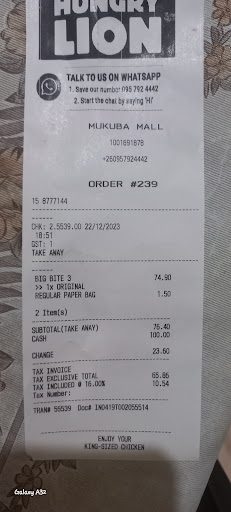 Firstly the food is absolutely amazing and delicious the only problem is poor customer service in terms of attitude by the people working there especially the outlets kitwe including one at Mukuba Mall where they look at the status before you are served in time. Remember Hungry Lion is a family cafeteria where most people would rather go and seat and enjoy the comfort and the goodness of the meals but if the attitudes of your employees in these places continues then it may attract bad business. Thank you for your services in these other outlets...