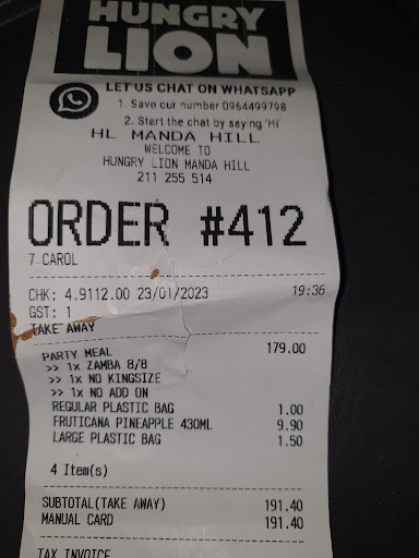Read moreThe only Hungry Lion I would ever under star is the Kafue Mall branch for there drop in fry standards and too oily chicken, other places I have been are so good I would make hungry lion my lunch, supper and breakfast the next day🙈 Overall it’s a clean and alright place to have a quick “to go meal” inside and outside sitting and continue with your...